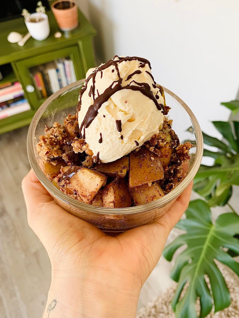 - Let the crumble cool for 15 minutes before serving. Top with vanilla ice cream, or whipped cream, and chocolate sauce if you’re feeling wild! Enjoy!