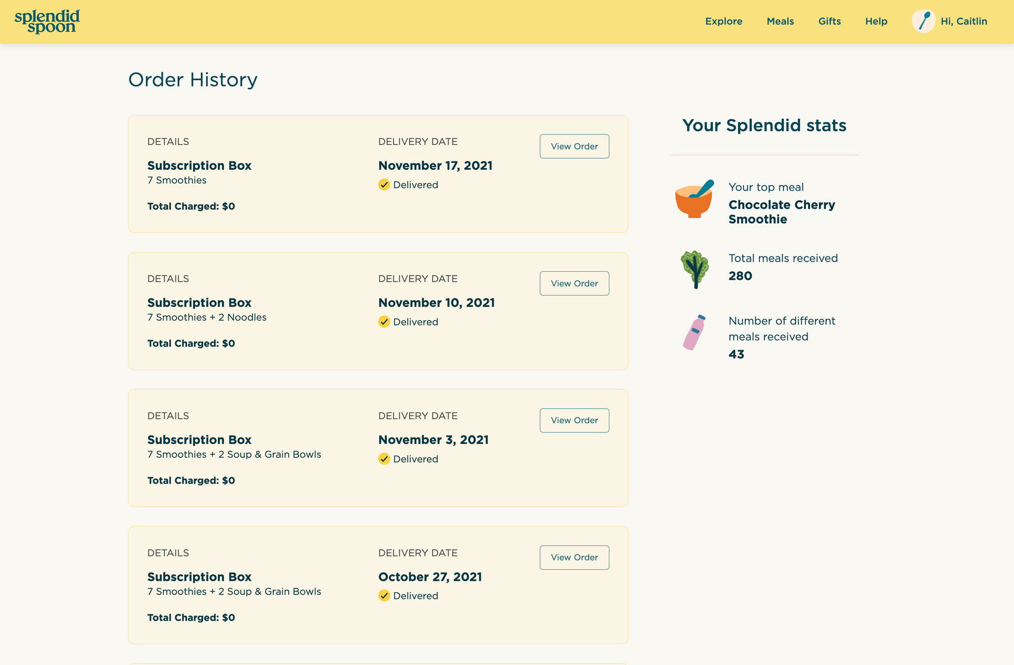 Want to know what your top meal is? Now you can find out, right from your Order History Page! The new Splendid Stats section will tell you what meal you've received the most often, how many total meals you've received, and how many different varieties you've tried in the last year!