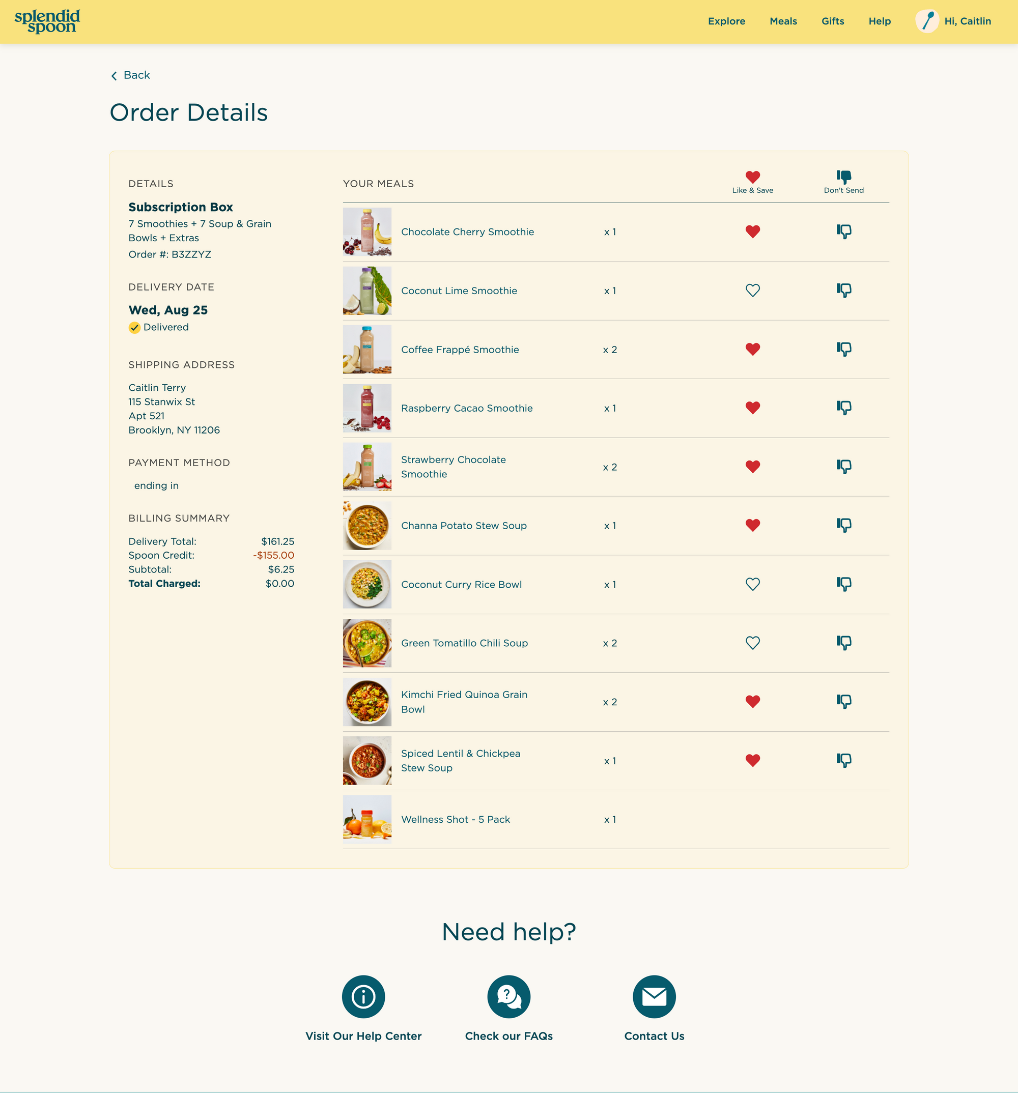 The Splendid Spoon tech team is back with another new feature as part of our entire site redesign, and we’re really excited about this one. Hot off the presses is our brand new Order Details page. We’re now giving you a full list of every meal you receive in a delivery - going back to your very first order with Splendid Spoon!