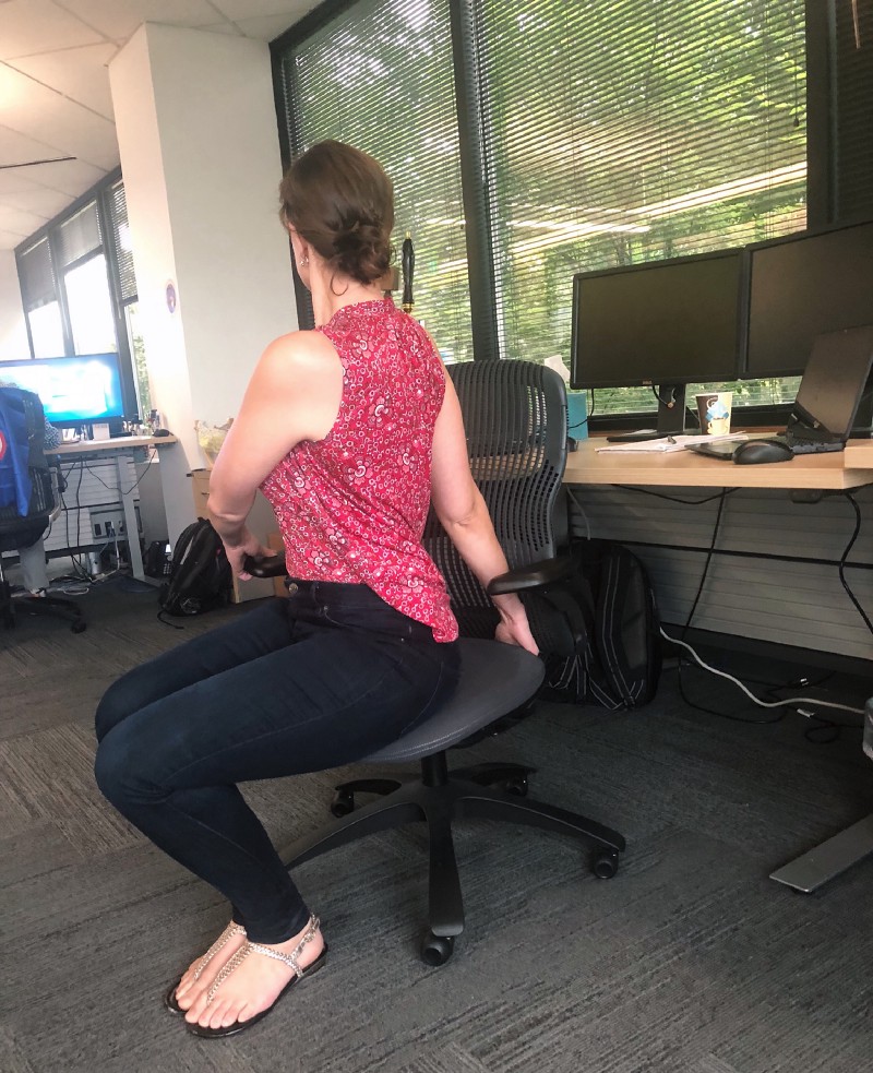 Place your hands on your desk. Bend your knees to lengthen your quads and engage your hamstrings. Lengthen your tailbone to the floor. Pull your lower ribs down and lift your chest up to engage your core.