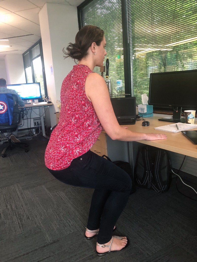 Stand up and rest your hands on your desk. Step back until your ankles are directly below your knees and hips.