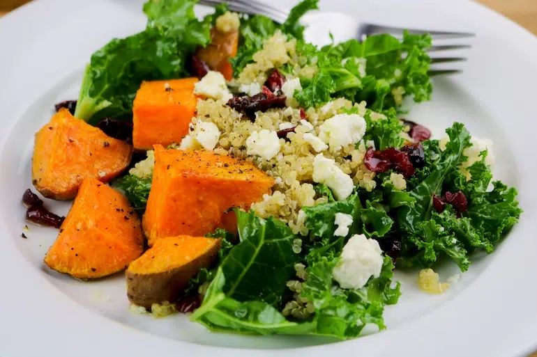 Incorporate fibrous, prebiotic sweet potatoes and probiotic-rich dried cranberries in a quick and easy winter salad. The addition of the almonds provides a good source of protein and fiber, which promote good gut flora and fullness. Of course, you can swap in any nut readily available if you’d like.